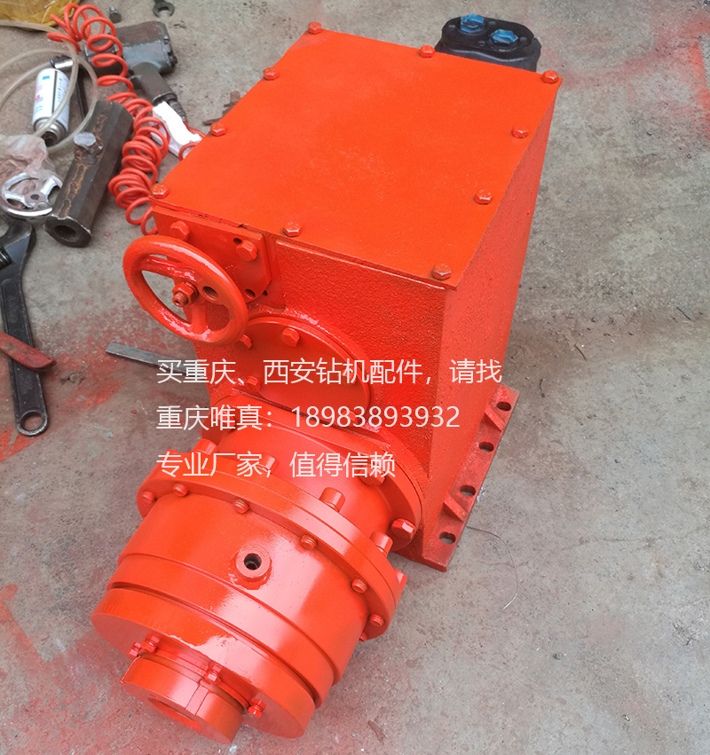 ZY2300动力头主要由液压马达、减速箱、卡盘、水辫等组成。主要是将液压能转化为机械能的机构。压力油驱动液压马达,经减速箱减速后带动中空主轴、液压卡盘、水辫和钻具旋转,输出转速和转矩。减速箱为两级齿轮传动机构,采用牙嵌离合器变速。减速箱前端面设有调速手轮,旋转调速手轮可实现高速、空位、低速三个档位变换。卡盘采用碟簧夹紧钻杆,油缸完成松开钻杆动作,该卡盘可直接夹紧钻杆或前置水辫.