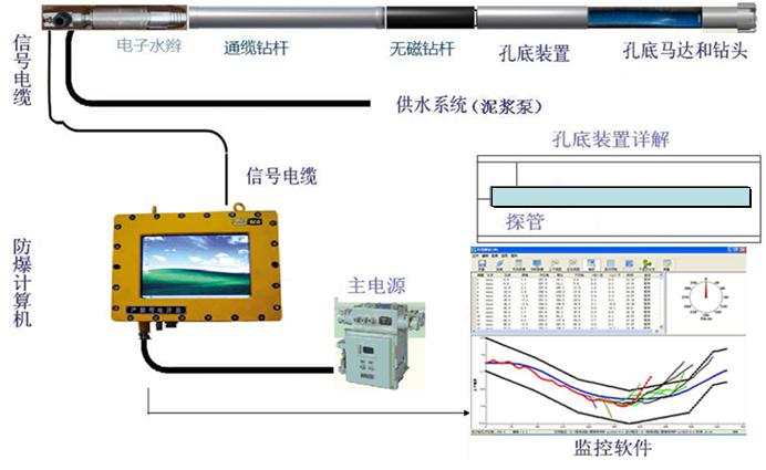 采用回转钻进模式开孔,定向钻进时,钻杆不转动,由泥浆泵输出的高压水驱动孔底马达旋转钻进,通过高精度孔底随钻测量仪测量钻孔轨迹,在防爆计算机上实时显示,通过调整孔底马达的弯头方向在一定范围内对钻孔轨迹进行调整,达到预期的轨迹要求。